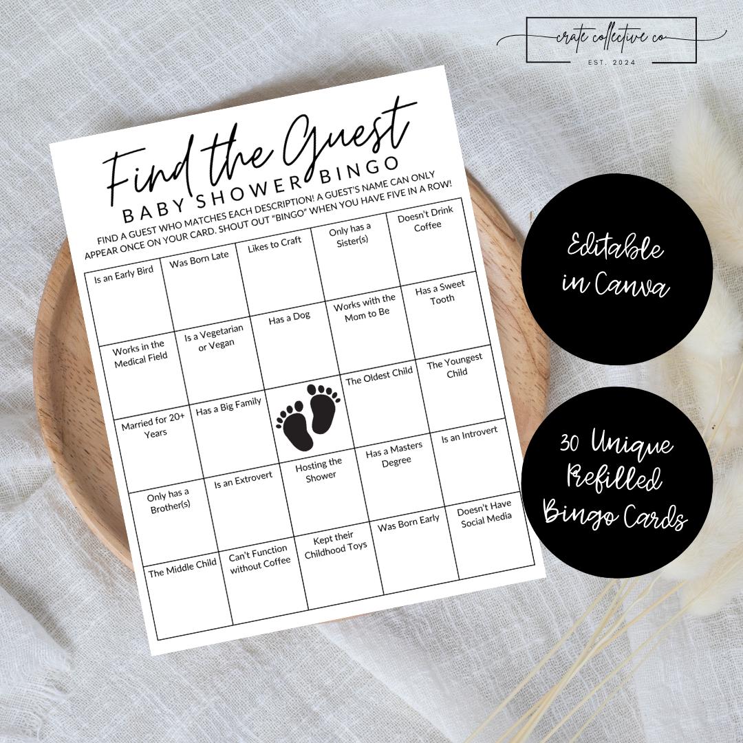 "Diese editierbare Finde die Gast Baby Shower Bingo Karte bietet eine unterhaltsame Aktivit&aum...