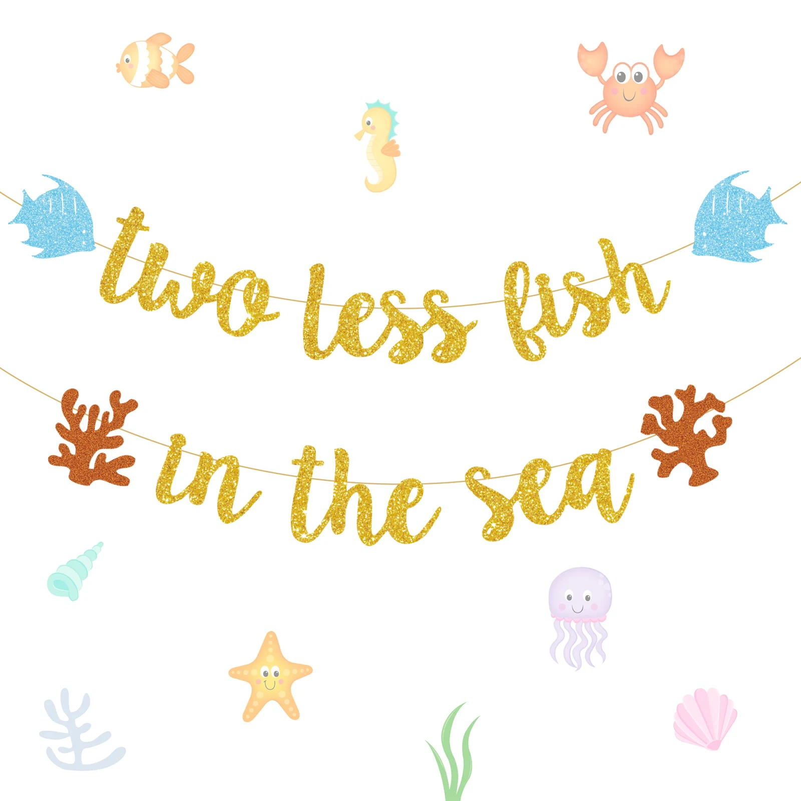 Zwei weniger Fische im Meer, goldfarbenes Glitzer-Banner für nautisches Meer, Thema, Verlobungs...