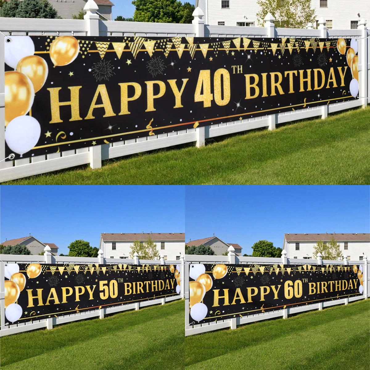 Schwarzgoldene Luftballons, Flaggen, alles Gute zum 40. 50. 60. Geburtstag, Banner, Geburtstagsparty...