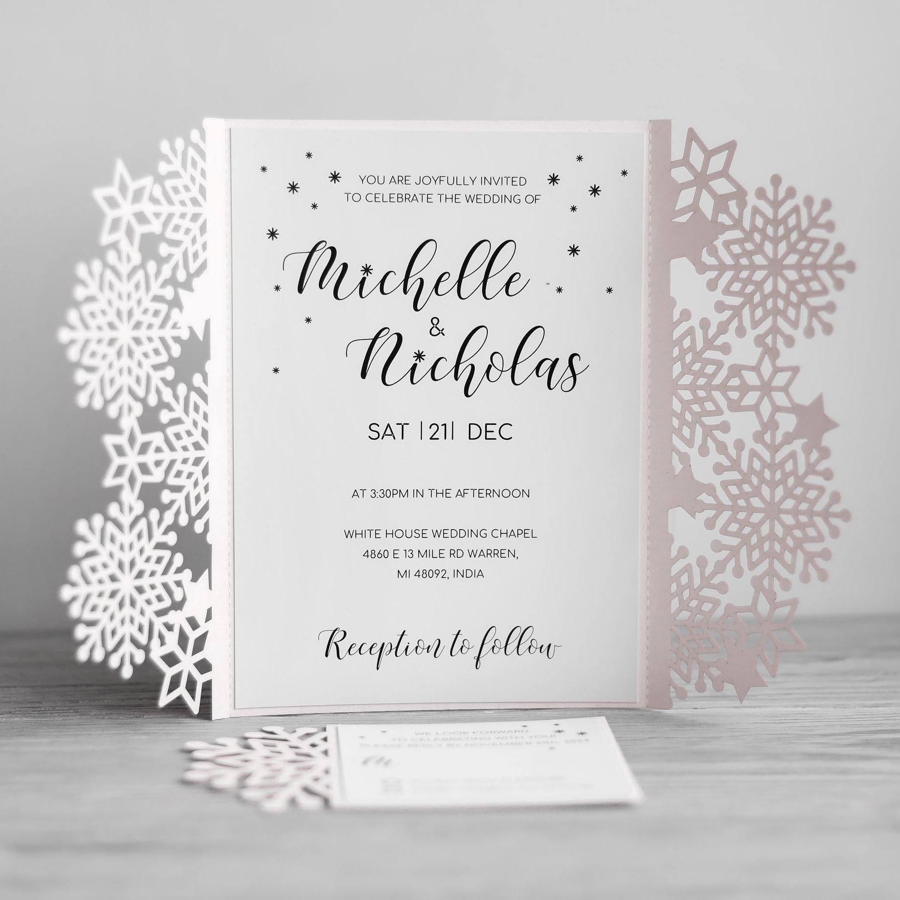 101.1 | Winter Schnee Hochzeit Einladungsgatefold svg Vorlage mit Schneeflocken, rsvp Karte und Perg...