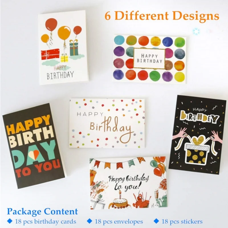 18er-Pack bunte Geburtstagskarten, 6er-Design-Happy-Geburtstagskarten mit Umschlägen und Aufkle...