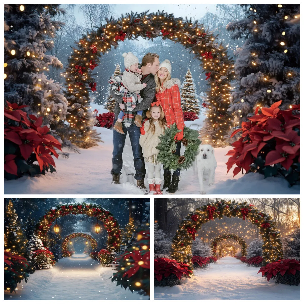 Weihnachtsbogen-Hintergrund, verschneiter Wald, Weg, Girlande, Kranz, funkelnder Baum, Urlaub, Famil...
