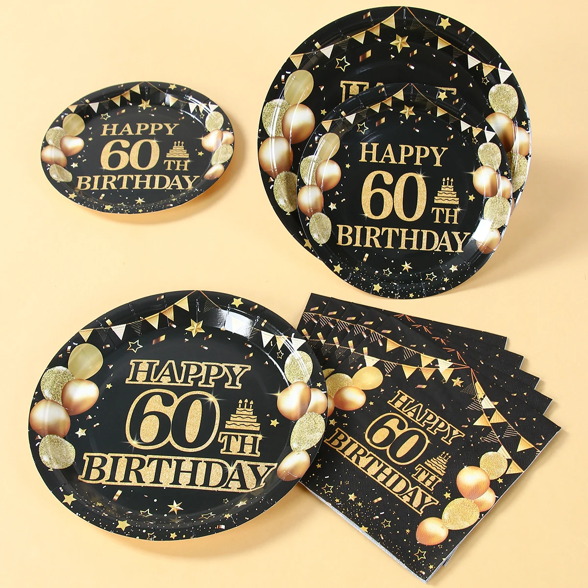 Einweggeschirr zum 60. Geburtstag aus schwarzem Gold, alles Gute zum 60. Geburtstag, Party-Dekoratio...
