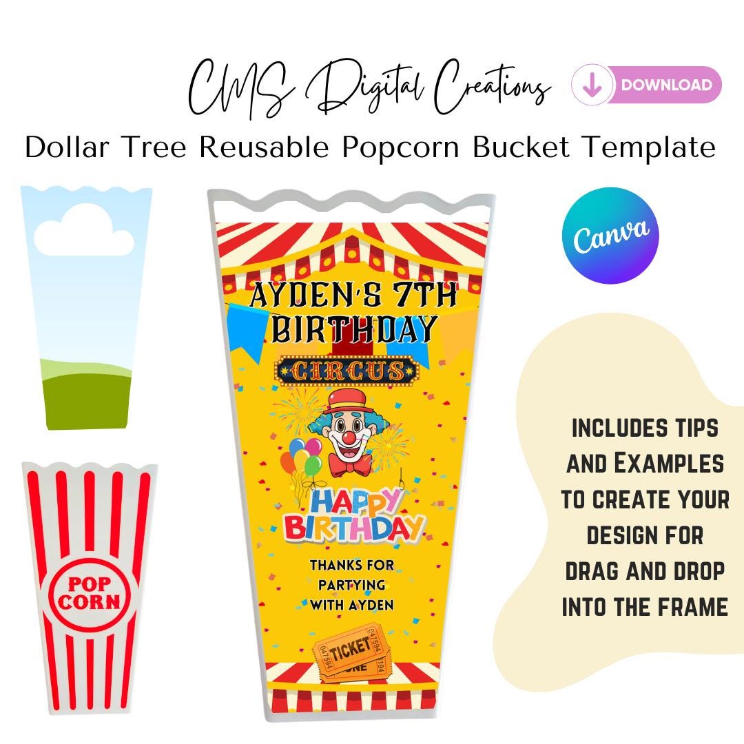 Mit dieser bearbeitbaren Canva-Vorlage kannst du ganz einfach personalisierte Popcorn-Eimer-Designs ...
