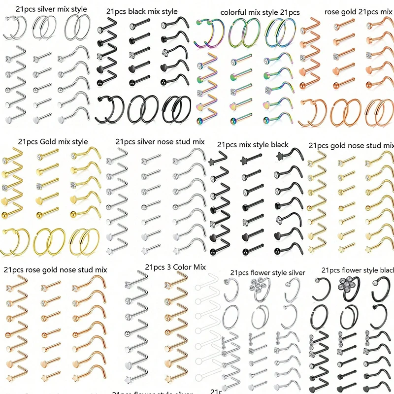 21 teile/los 20g Edelstahl Nasenring Stud Set Herz Kristall Nase Piercing Schraube l Form Nasenloch ...