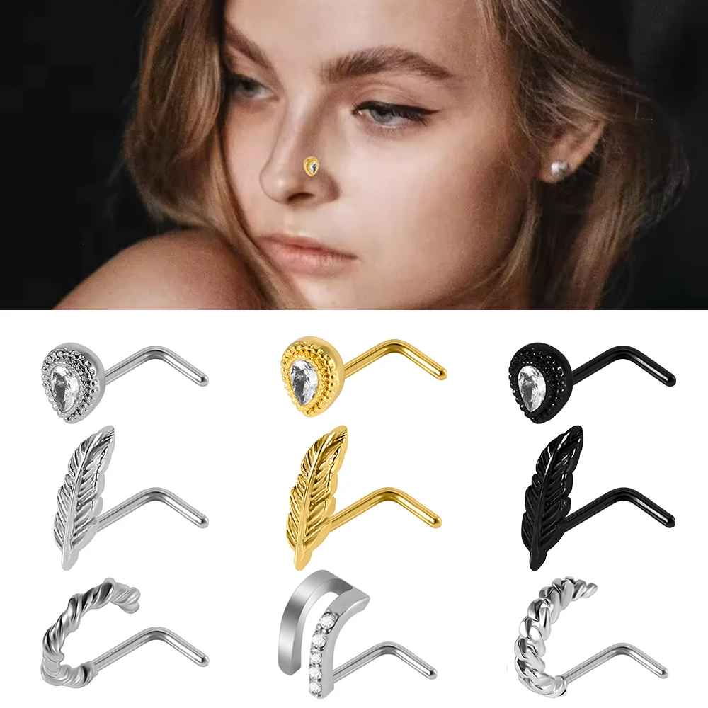1/3PCS Nette Kristall Nase Stud L-Form 20g Edelstahl Nase Piercing Tropfen Wasser Feder Kurve form Z...