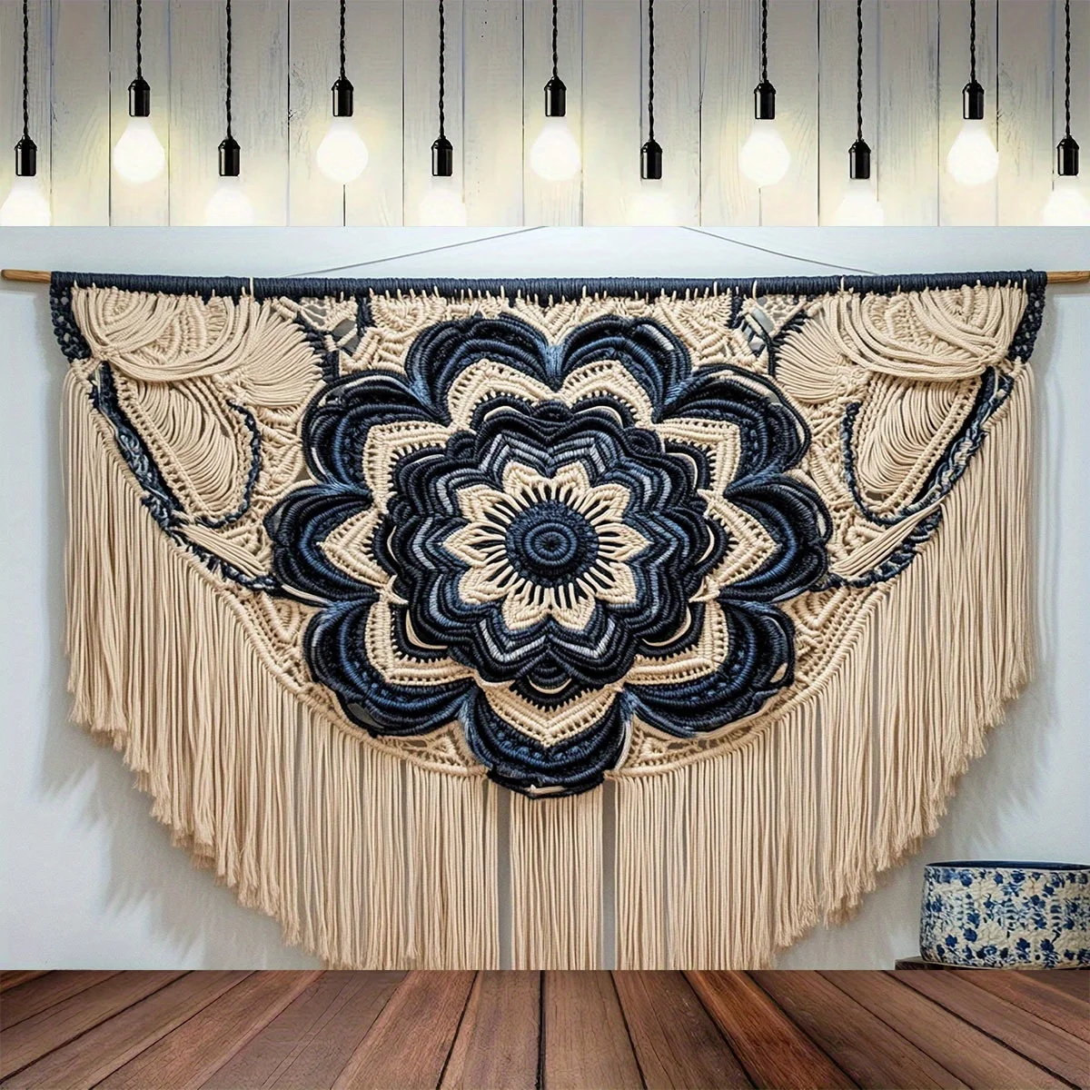 A Bohemian Macron wall-mounted canvas with exquisite tassels, blue flowers and wooden pole decoratio...