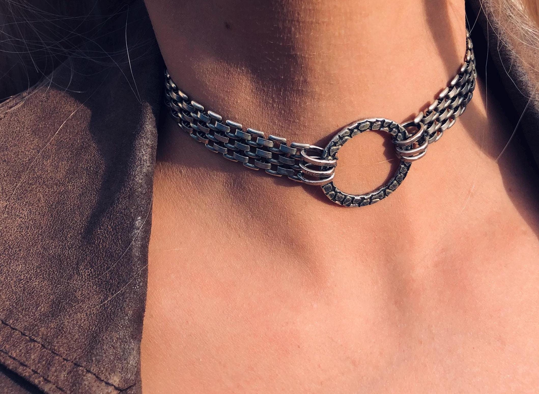 "Ein auffälliger silberner Choker mit einem großen kreisförmigen Mittelstü...