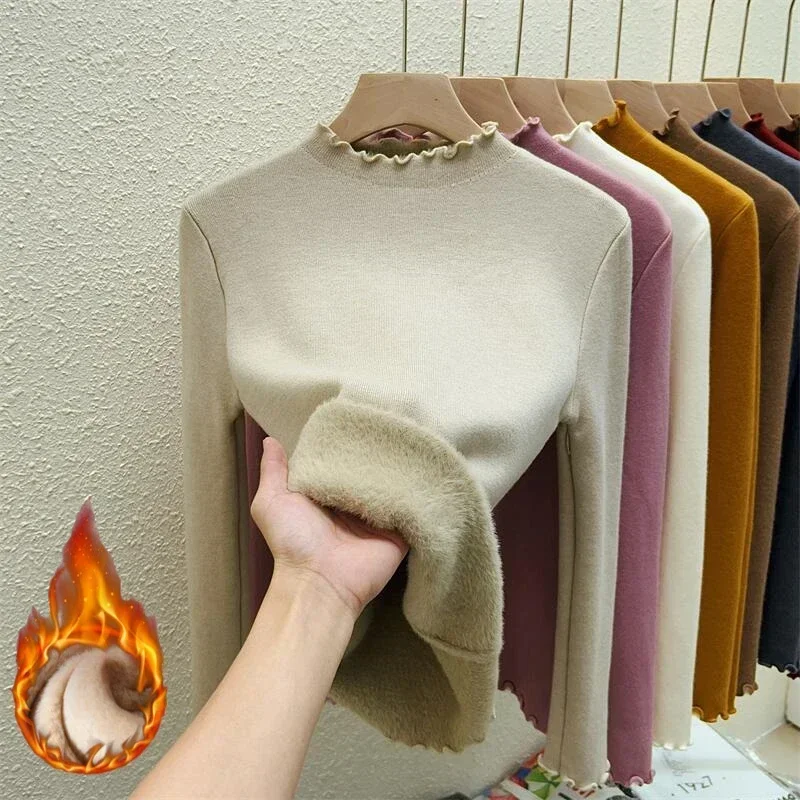 Frauen Elegante Dicke Samt Gefüttert Warme Sueter Gestrickte Pullover Geraffte Rollkragen Herbs...