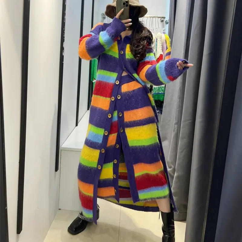 Frauen Süßigkeiten Kontrast farbe x-lange Regenbogen gestreiften Pullover Mantel Vintage ...