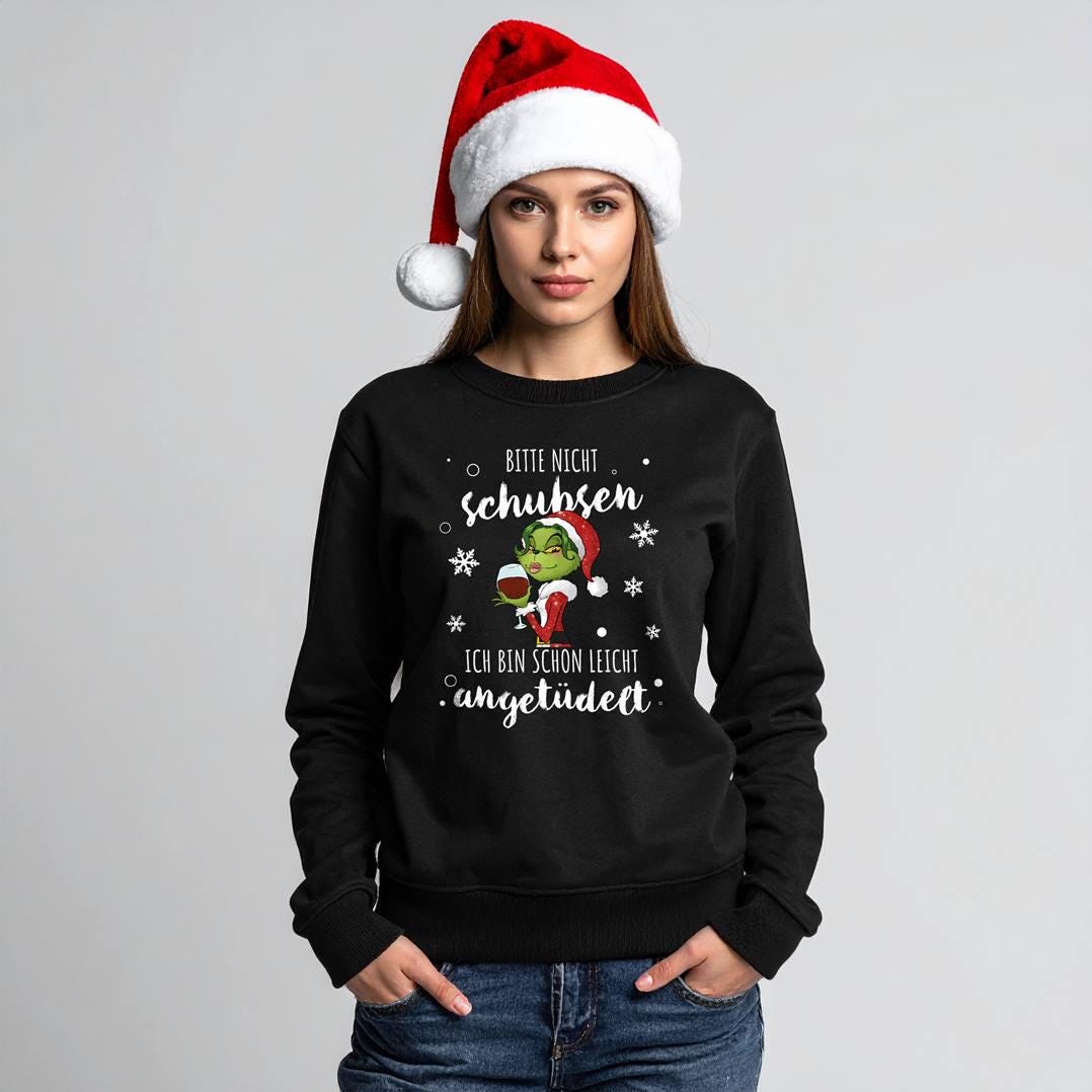 "Hochwertiger Pullover mit Miss Grinch Motiv und Spruch: Bitte nicht schubsen, ich bin schon le...