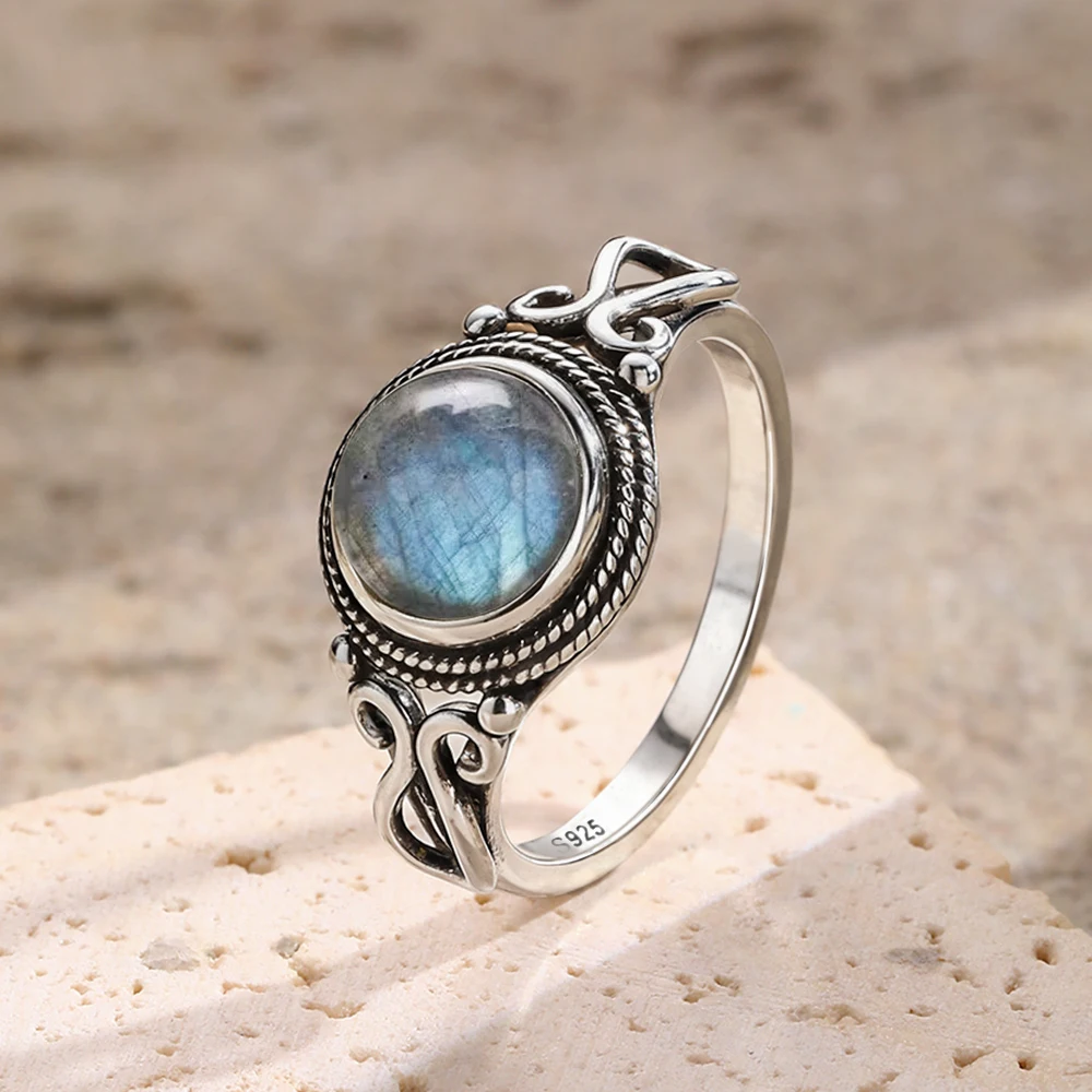 Vintage-Ring aus 925er-Sterlingsilber mit natürlichem Labradorit-Stein, 8 mm, runde Form, stark...
