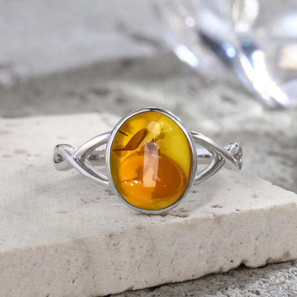 S925 Sterling Silber Ring mit natürlichem Bernstein Stein Blumenform Oval Blütenblatt Bern...