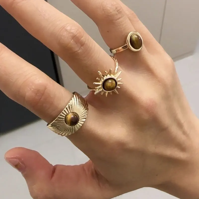 3 Teile/satz Vintage Sonne Blume Tigerauge Stein Ringe für Frauen Unregelmäßigen Bra...