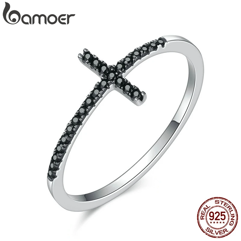 BAMOER Beliebte 925 Sterling Silber Glauben Kreuz Form Finger Ringe für Frauen, schwarz Klar CZ...