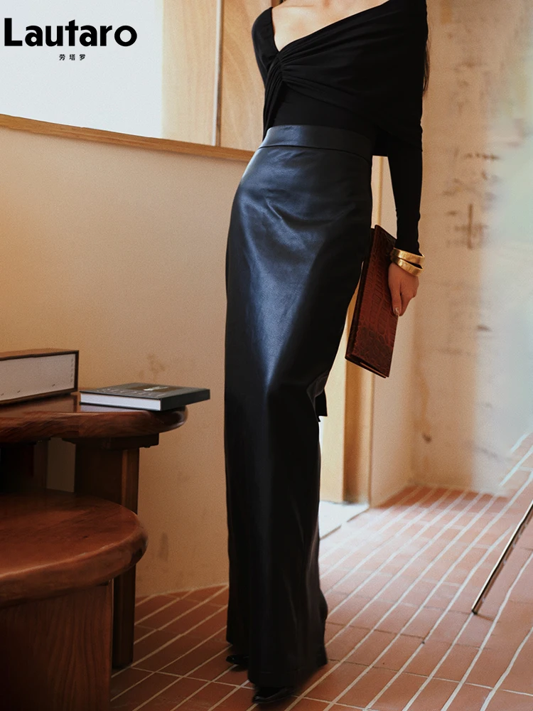 Lautaro Frühling Herbst schwarz weiches pu Leder boden langer gerader Rock Frauen mit Rück...