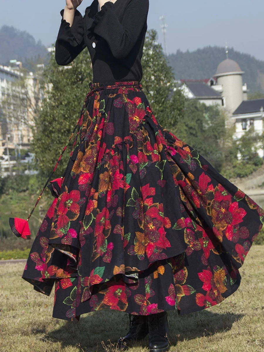 Baumwolle und Leinen Frau Mittelalter Rock Mode Blumendruck Retro Eid Stil Unregelmäßiger...