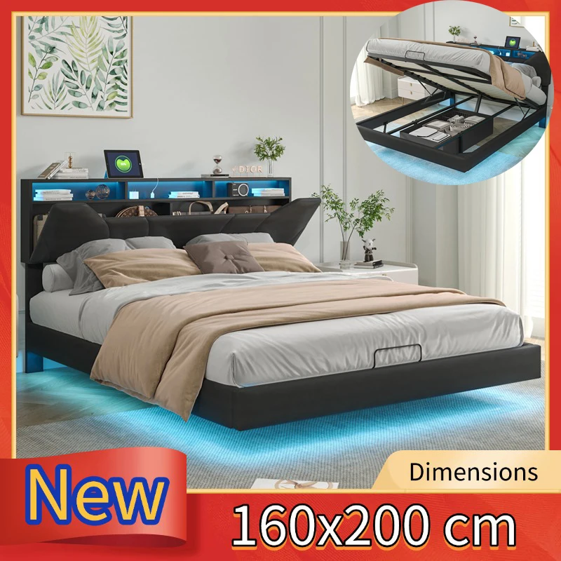 Creahappy Polster bett, Doppelbett rahmen, verdecktes Aufbewahrung kopfteil mit Euro-Stecker und LED...