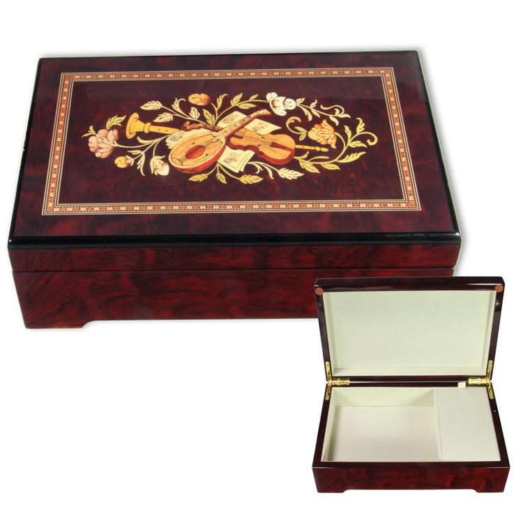 Dunkle Schmuckschatulle Instrumentenmotiv mit Spieluhr