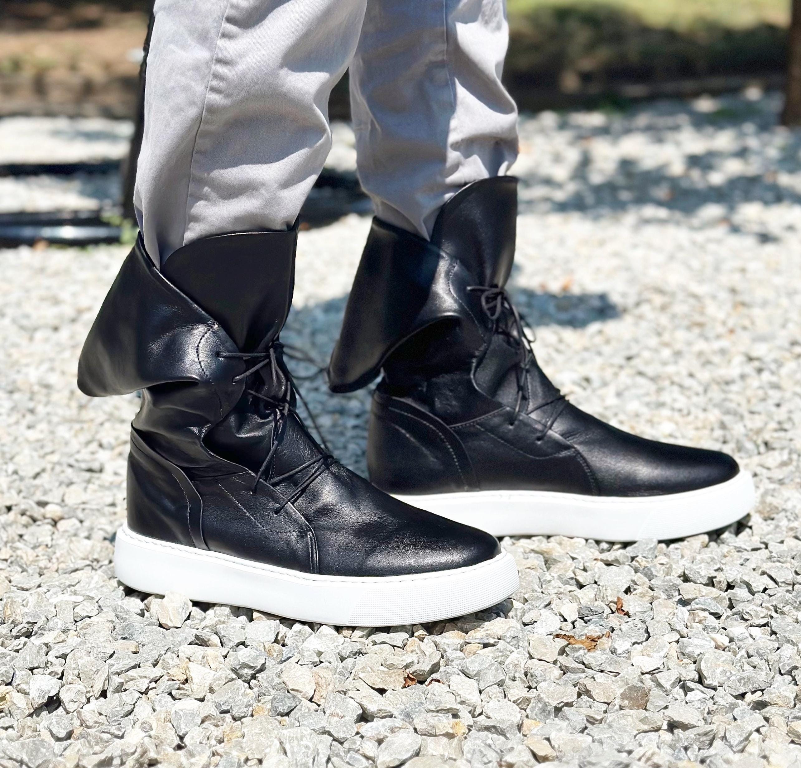 • Herren Echtleder Sneakers Stiefel, Herren Lederstiefel, schwarze Le...