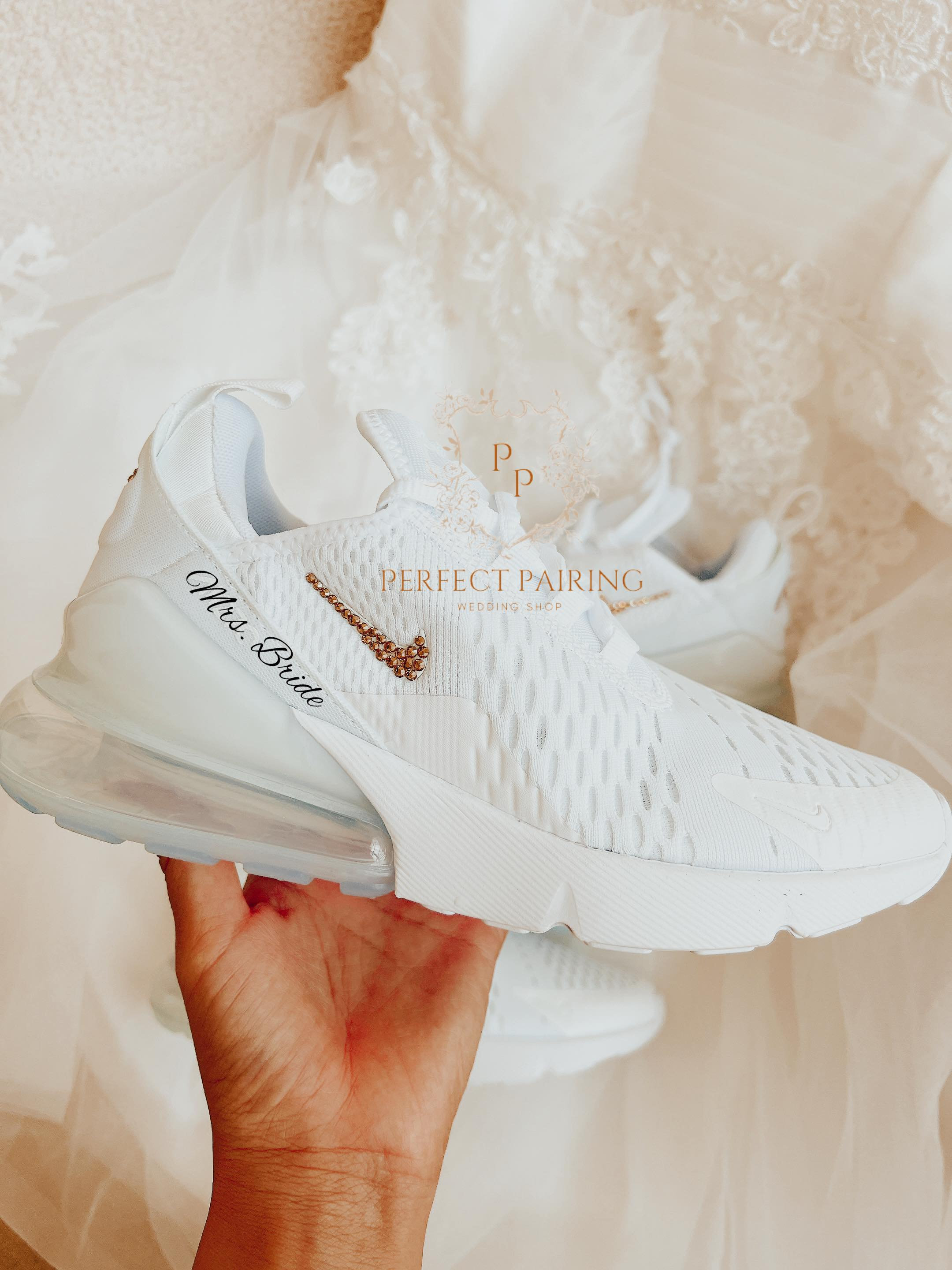 Treten Sie in Ihren besonderen Tag mit diesen atemberaubenden weißen Air Max 270 Strass-Turnsc...
