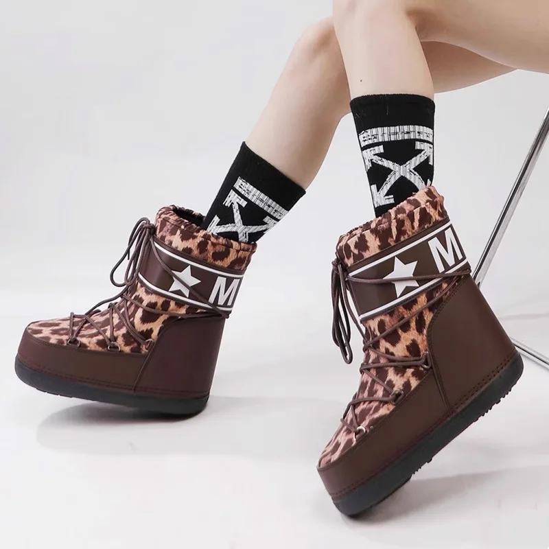 2025 neue Leopard Winter Raum Ski Stiefel Frauen Verdicken Innere Warme Kurze Stiefel Frau Wasserdic...