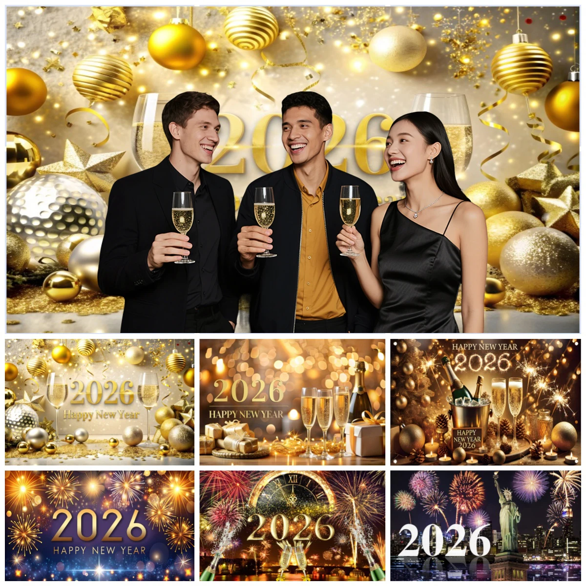 Neujahr 2026-Fotohintergrund, Champagner-Gold-Kugeln, Feuerwerk, Uh...