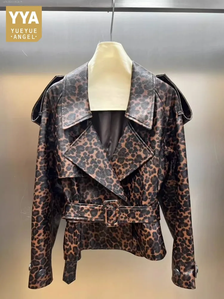Luxus Herbst Taille Krawatte Leopard Print Echt Schaffell Frauen Kurze Jacke Epaulet Gürtel Mot...