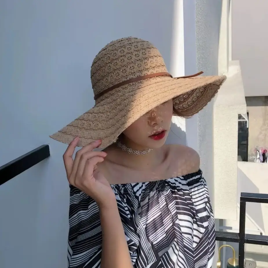 Sommer Hüte Für Frauen Sonnenhut Breiter Krempe Hohle Blume Mit Seil Bogen Sonnenhut Sonne...