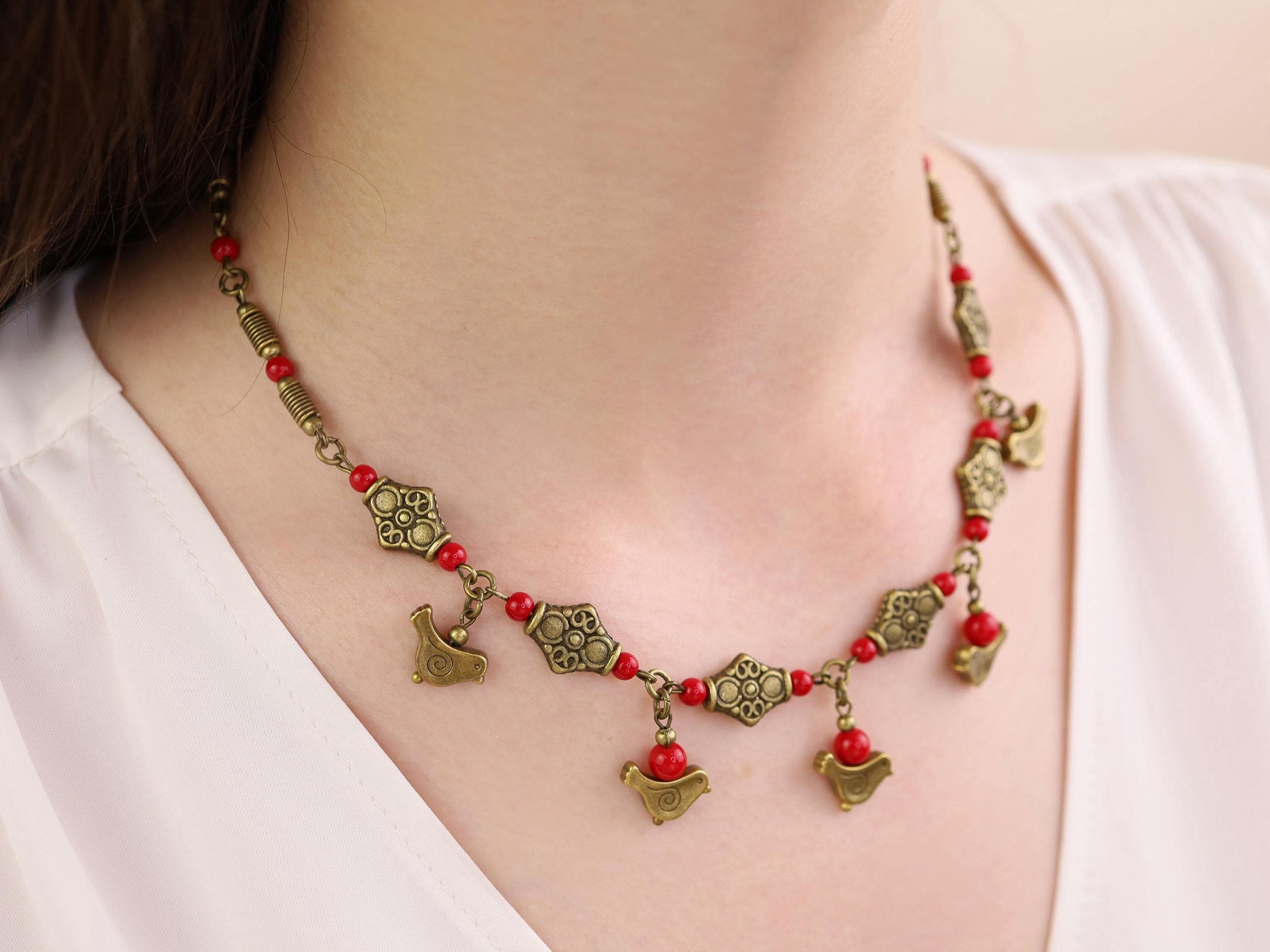 Zierliche rote Halskette mit Vögelchen Anhänger, Tier The...