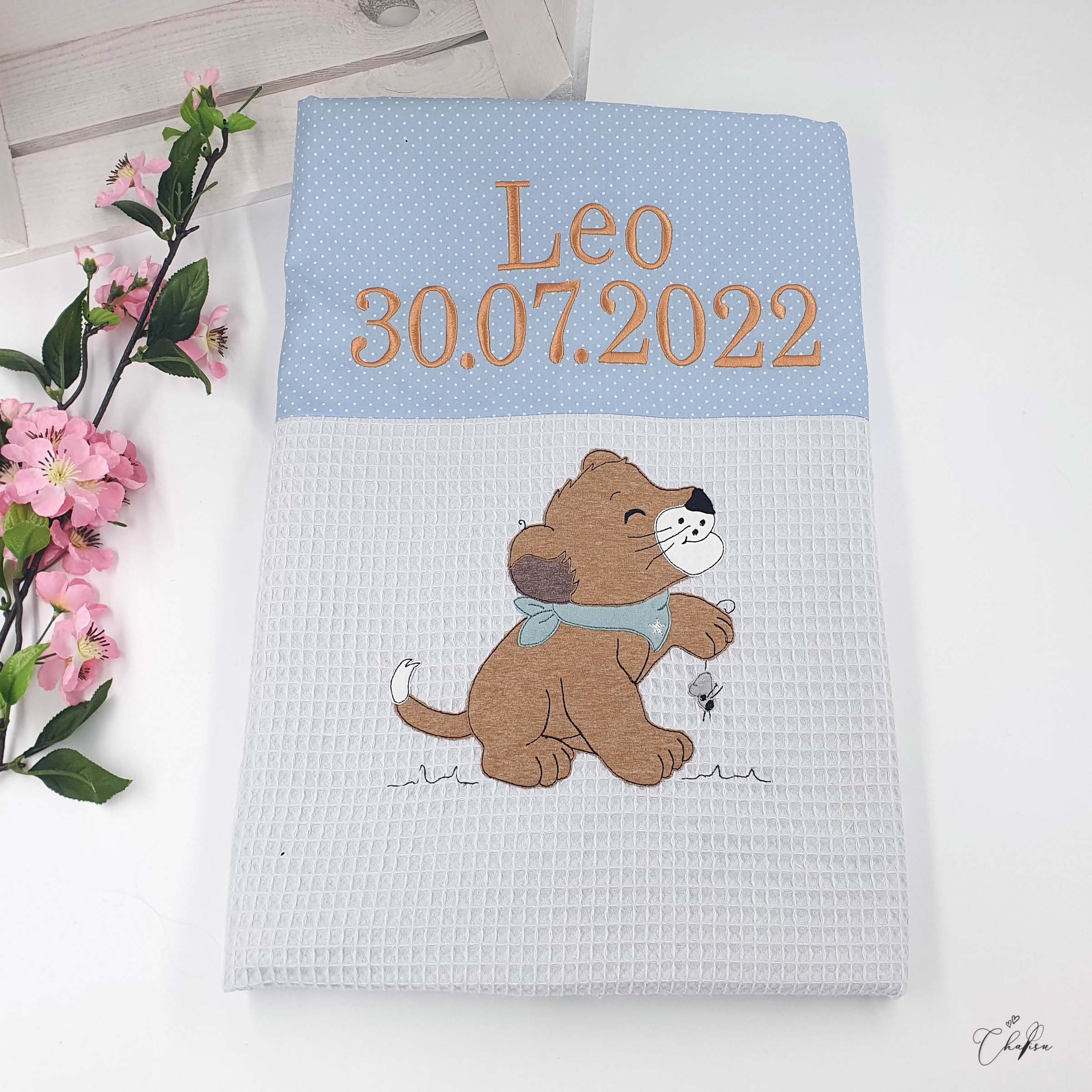 Kuscheldecke Stickdatei Löwe blau beige, Babydecke mit Name, K...