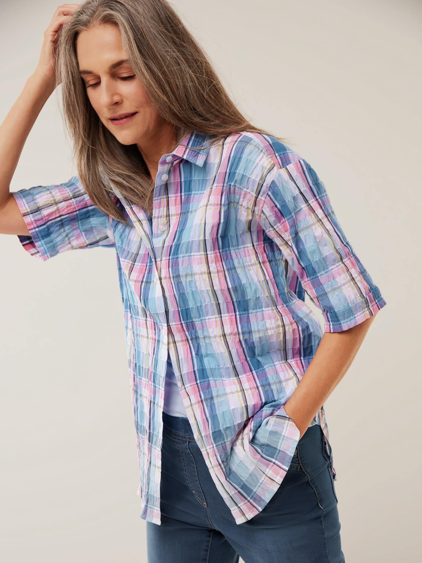Walbusch Damen Seersucker Hemd-Bluse Blau kariert
