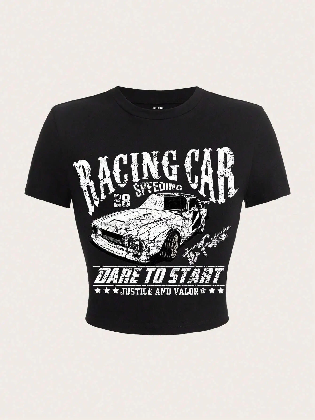 100% Baumwolle Frauen Crop T-shirts Hip Hop Racing Auto Gedruckt T-shirts Oansatz Engen Kurzen Ä...