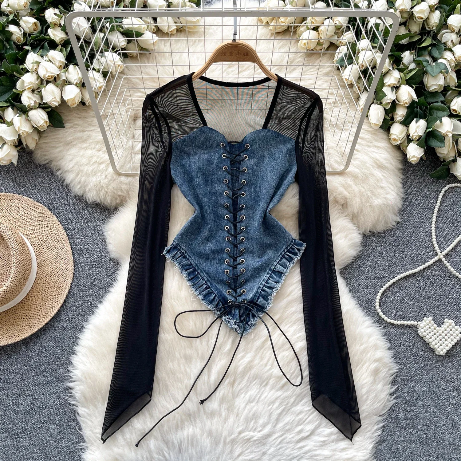 2025 neue Amerikanische Retro Patchwork Sexy Bluse Frauen Square Neck Long Sleeves Sheer Top Streetw...