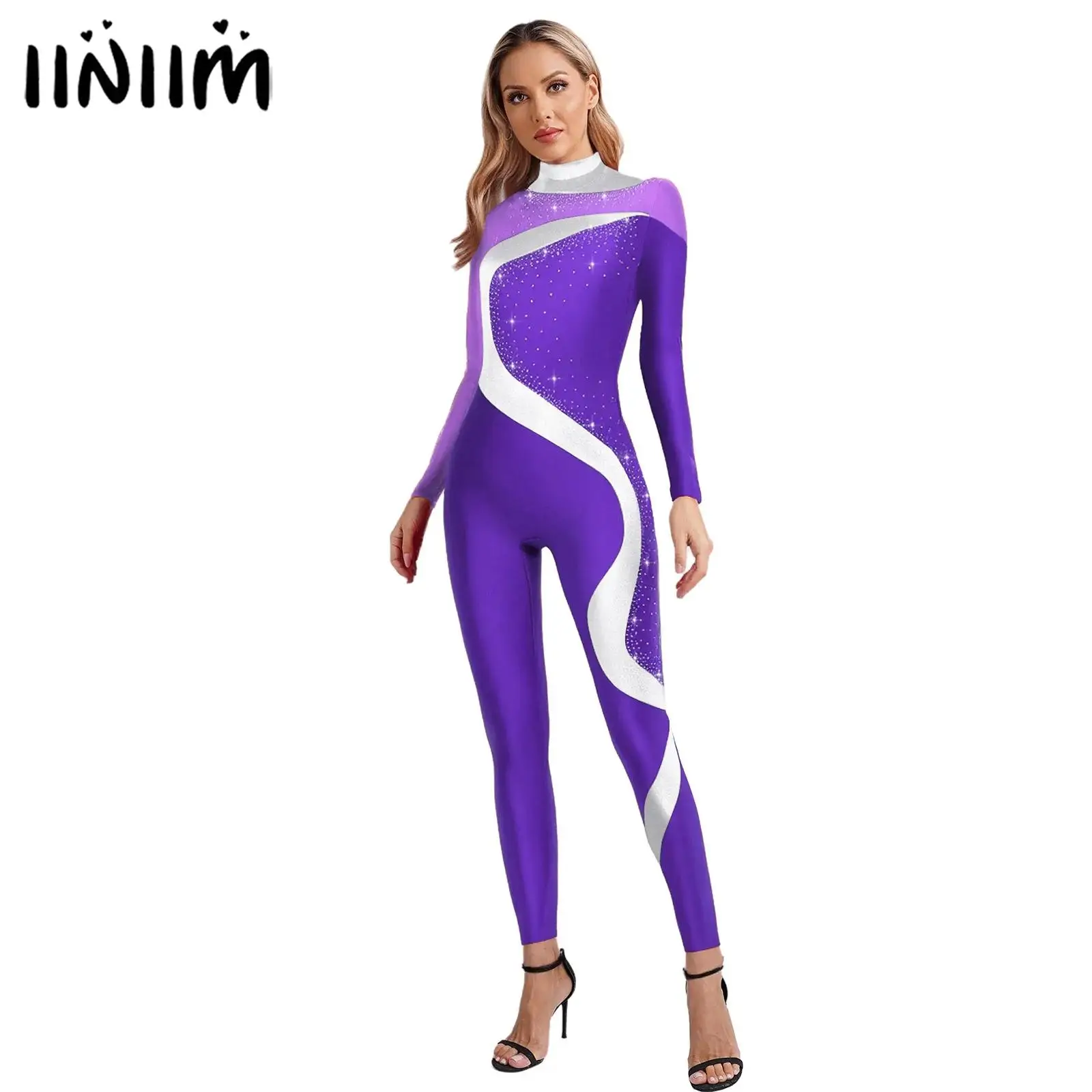 Damen Glitzer Gymnastik Tanzkleidung Eiskunstlauf Kostüm Farbblock Trikot Langarm Mock Neck Bal...
