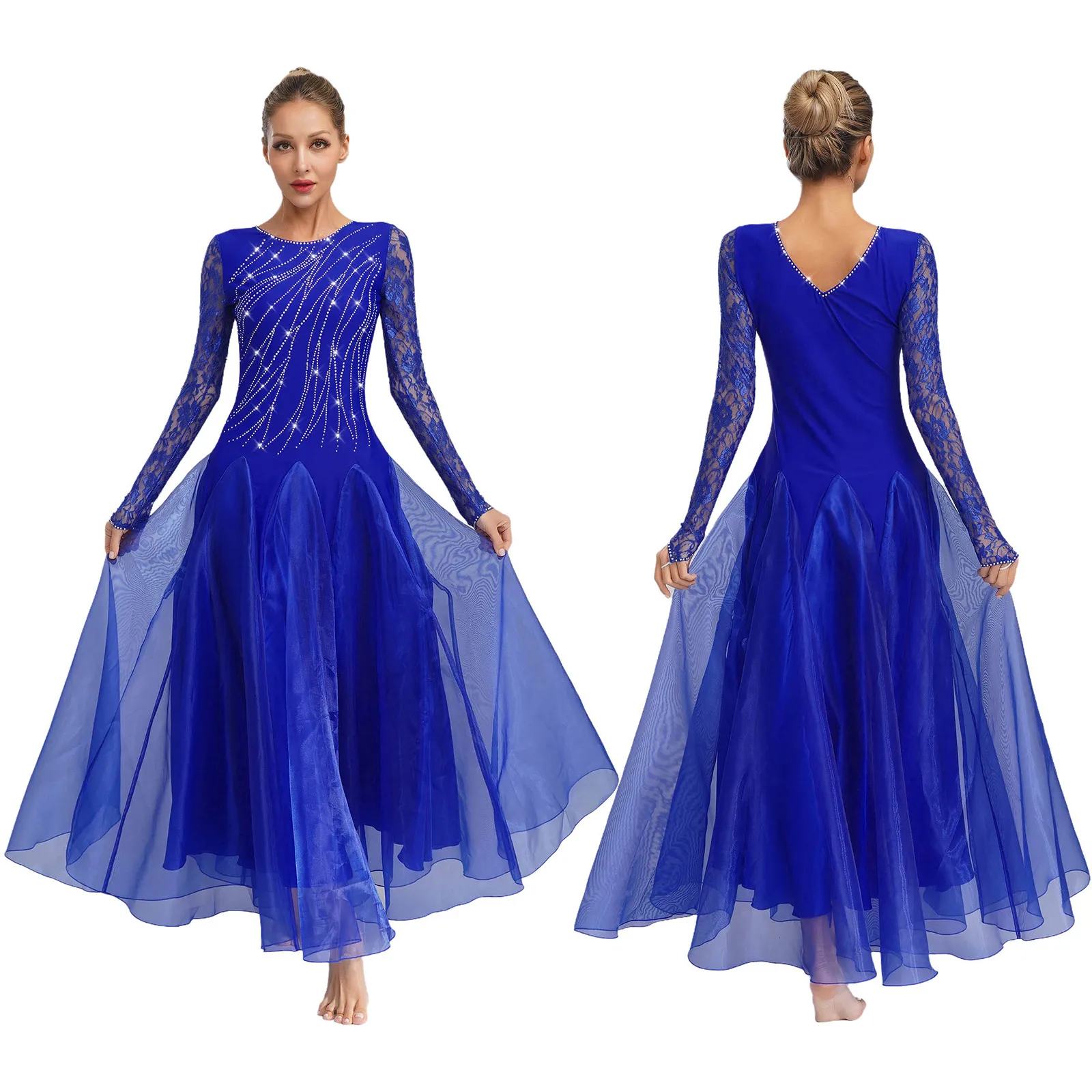 Damen Ballsaal-Tanzkleid, lyrisches spanisches Flamenco-Tanzkostüm, florale Spitze, lange Ä...