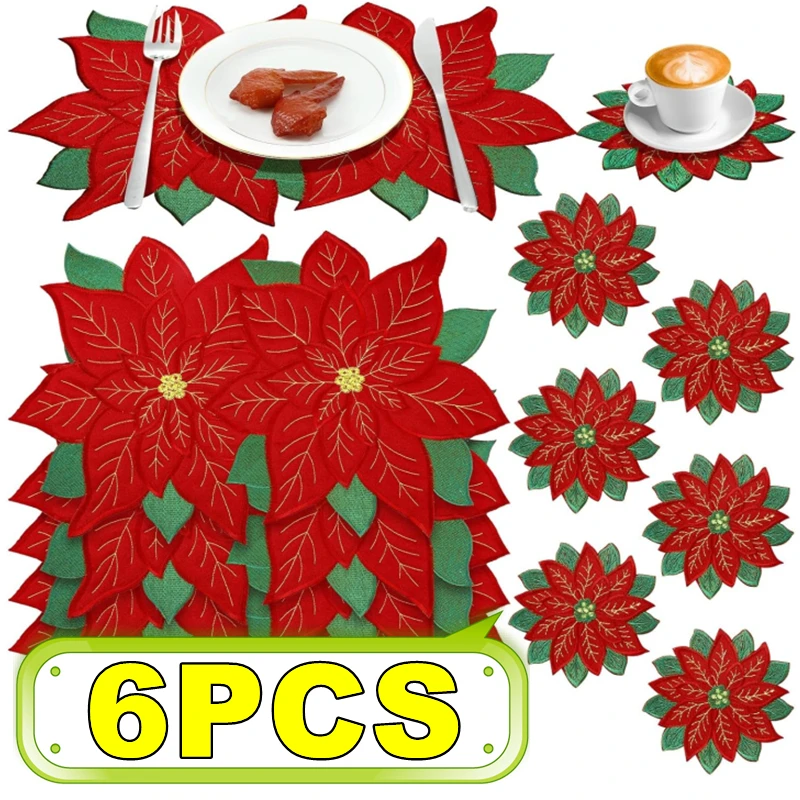 6-1pc Weihnachten bestickte Tischs ets Doppels chicht Deckchen Weihnachts blume Tischset Esszimmer U...