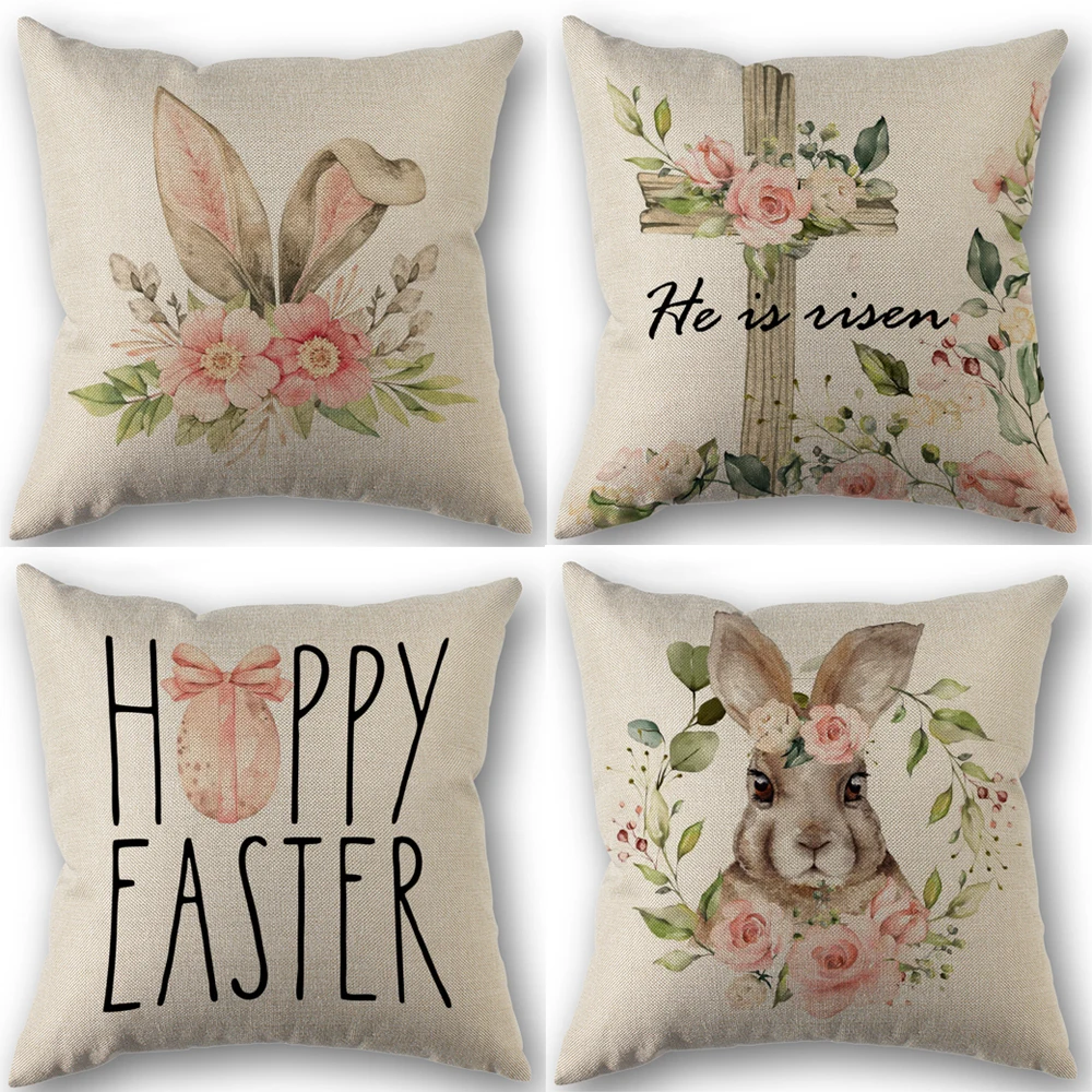 4pc glücklich Ostern Dekorationen für zu Hause Kissen bezug Linie Kaninchen Ohr rosa Blume...