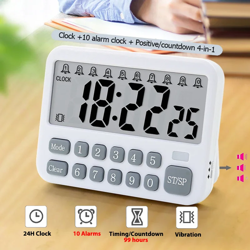 Digitaler Küchentimer, 24-Stunden-Uhr, 10 Wecker, 99 Stunden Countdown, Stummschaltung/Vibratio...