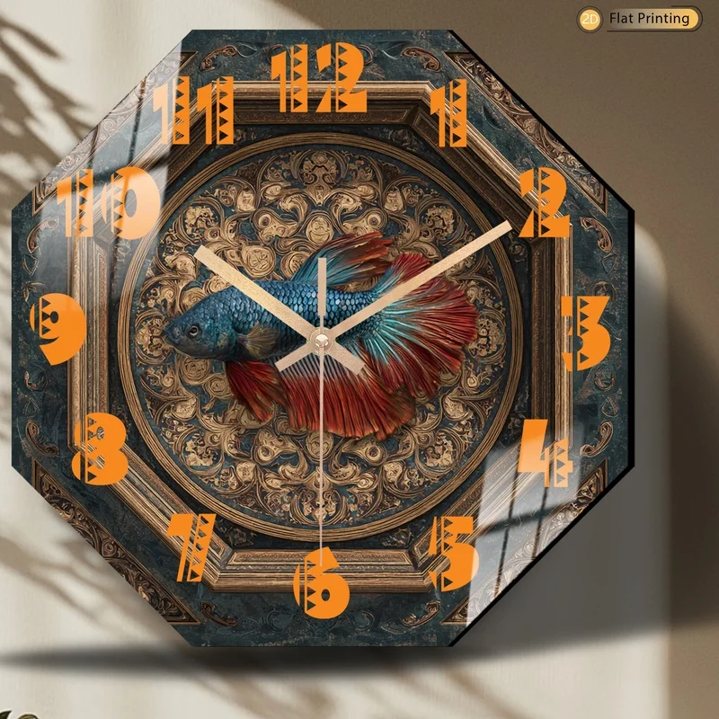Exquisite blaue achteckige Betta-Fisch-Wanduhr aus Holz für da...