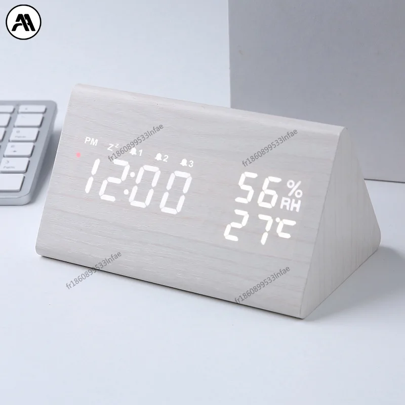 Digitaler Wecker aus PVC-Holz: Kalender, Thermometer, Hygrometer, elektronische LED-Dreiecksuhr