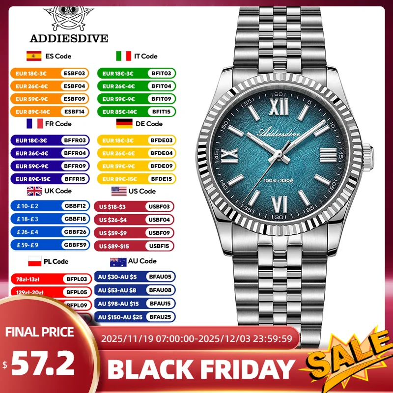 ADDIESDIVE AD2065 Quarzuhr Blase Spiegel Mineral Glas Kristall Edelstahl BGW9 Leuchtende 100 m Wasse...