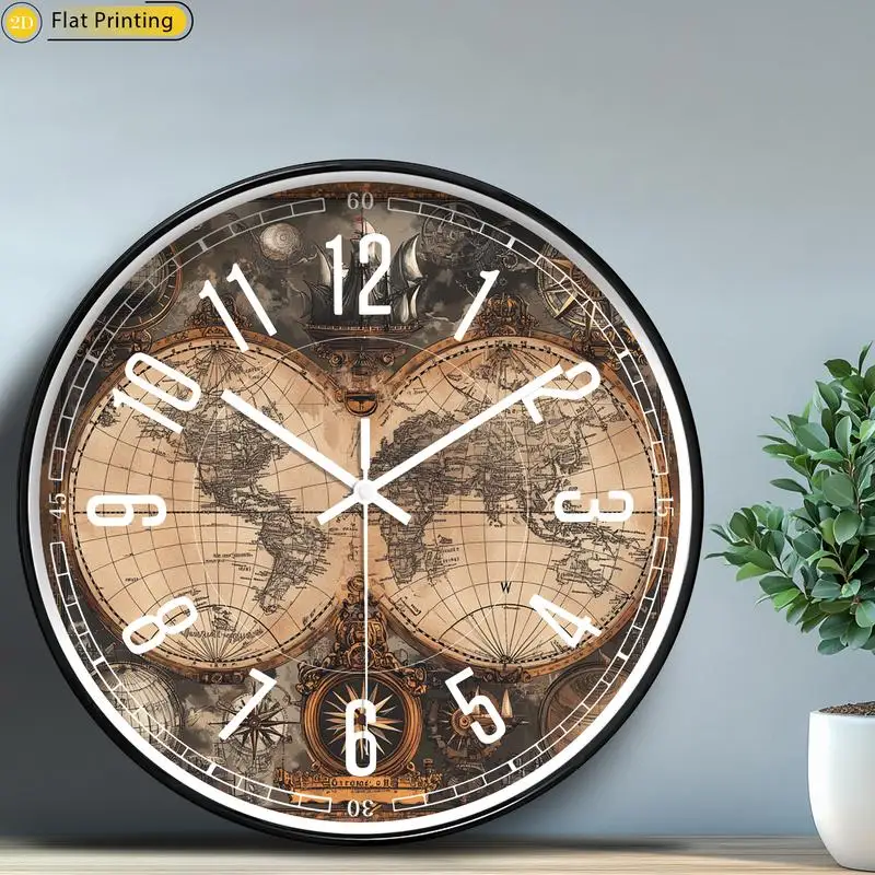 Stille Wanduhr aus Holz, Vintage-Weltkarte, Zirkel, runde Quarz-Ana...
