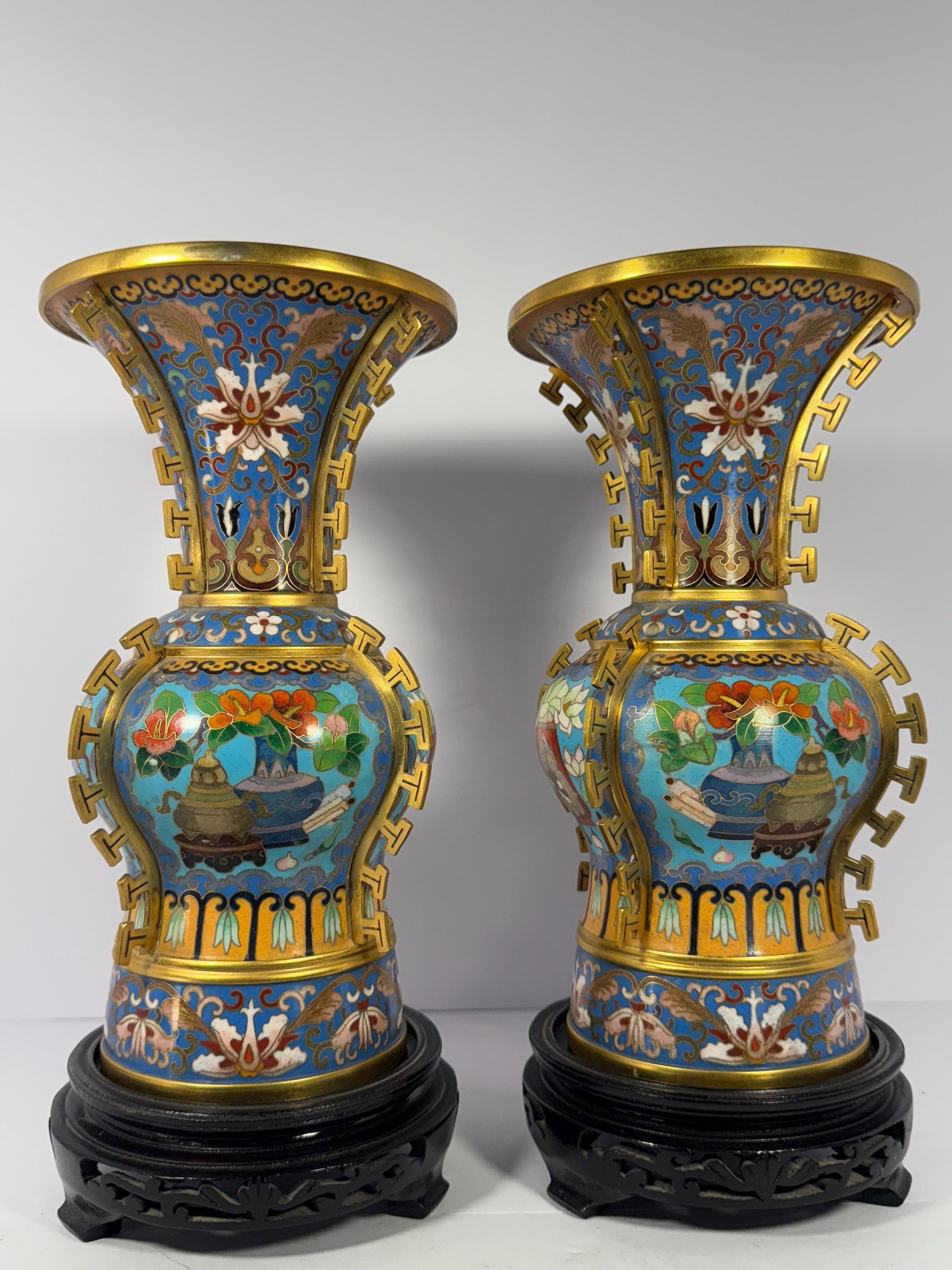 Ein auffälliges Paar Vintage chinesische Cloisonné-Emailvasen im Stil der Qing-Dynastie,...