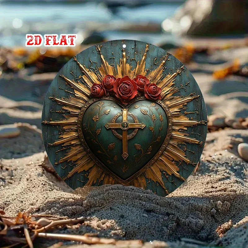 2D Flat 1pc religiös - Symbol Rundes Aluminiumschild, heilig - Herz Metallblechschild - Rosen R...