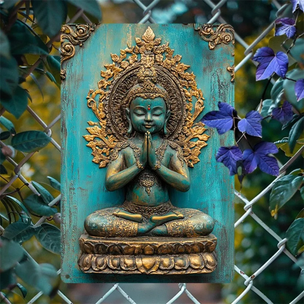 Vintage-Gemälde aus Blech, 2D-Metall-Türkis-Buddha-Statue-Schild – Aluminium-Blech-W...