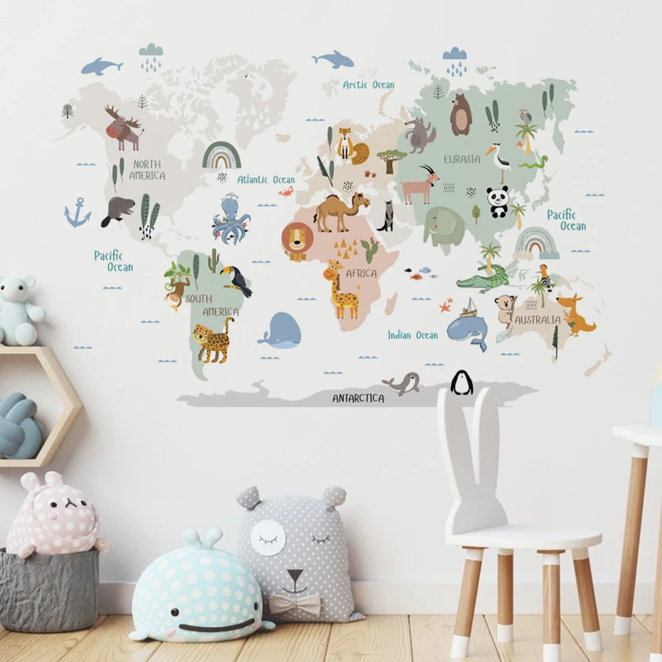 Aquarell Cartoon Weltkarte Wandaufkleber Tiere Wildtiere Kinder Vinyl Kinderzimmer Kunst Aufkleber f...