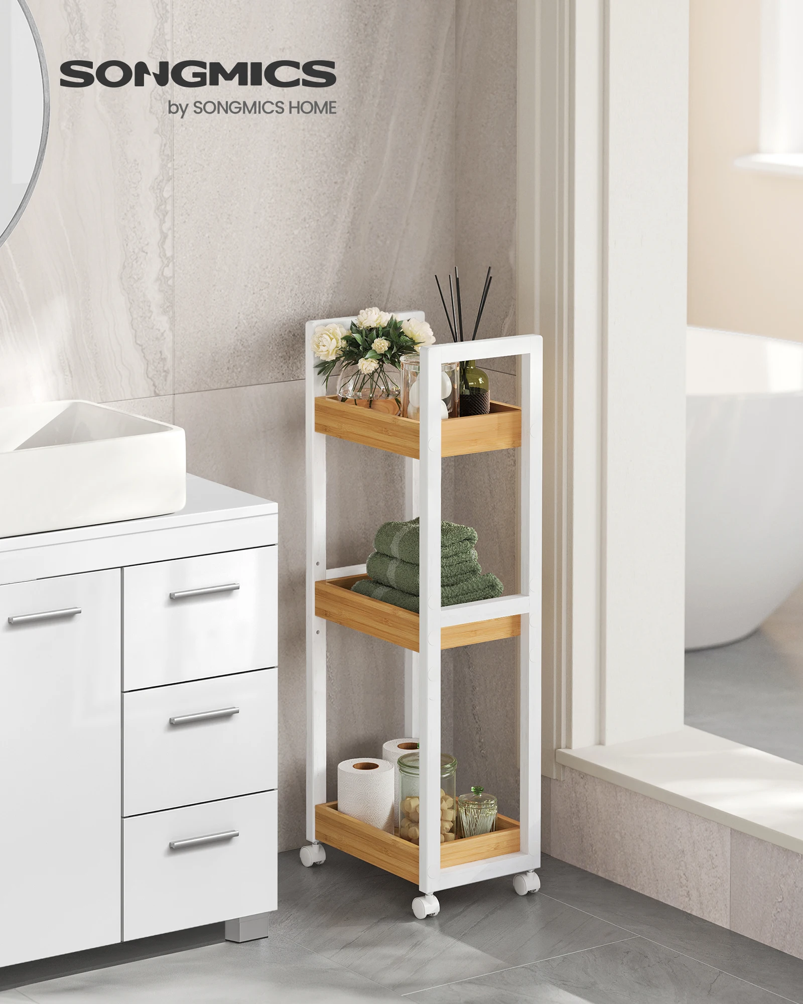 SONGMICS Rollwagen, Badregal, Badezimmerregal mit 3 Ebenen, Nischenregal Bambus, Regal schmal, Nisch...