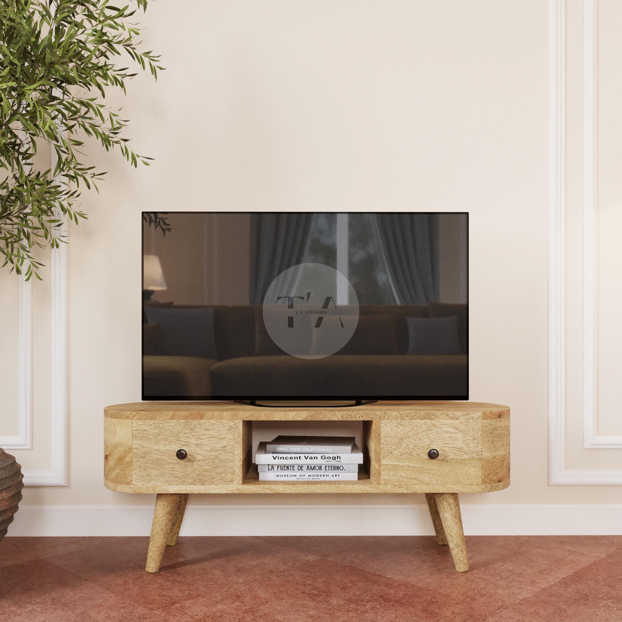 Unser kleiner, kompakter, natürlicher, leichter TV-Ständer aus Mangoholz mit zwei gerä...