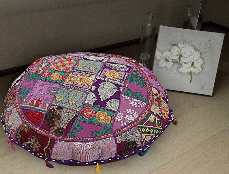 "Indian Pouf Round Indian Handmade Patchwork Vintage Round Cushion Cover Home Decorative Floor ...